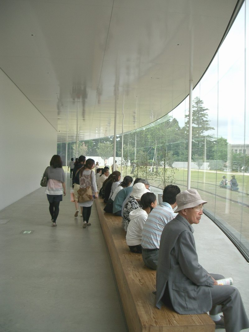 いかにも彼ららしい、白を貴重とした軽やかな構造美。写真に見える細い丸柱が妹島作品だぞ、ってのを主張している。街のどこからでもアプローチ可能な様に、正面と裏の区別がない円形が採用されたらしい。外壁はぐるりとガラスで囲まれていて芝生の庭からの光がたくさん入り込んで、白の壁に反射し思ったよりも明るい。内部にもガラス張りの部分が多く開放感があり、常に人の動きと外の空気を感じられる。円形の建物の中を箱で仕切る様に出来ている展示室。平面図がそのまま美術館のマークとなっています。