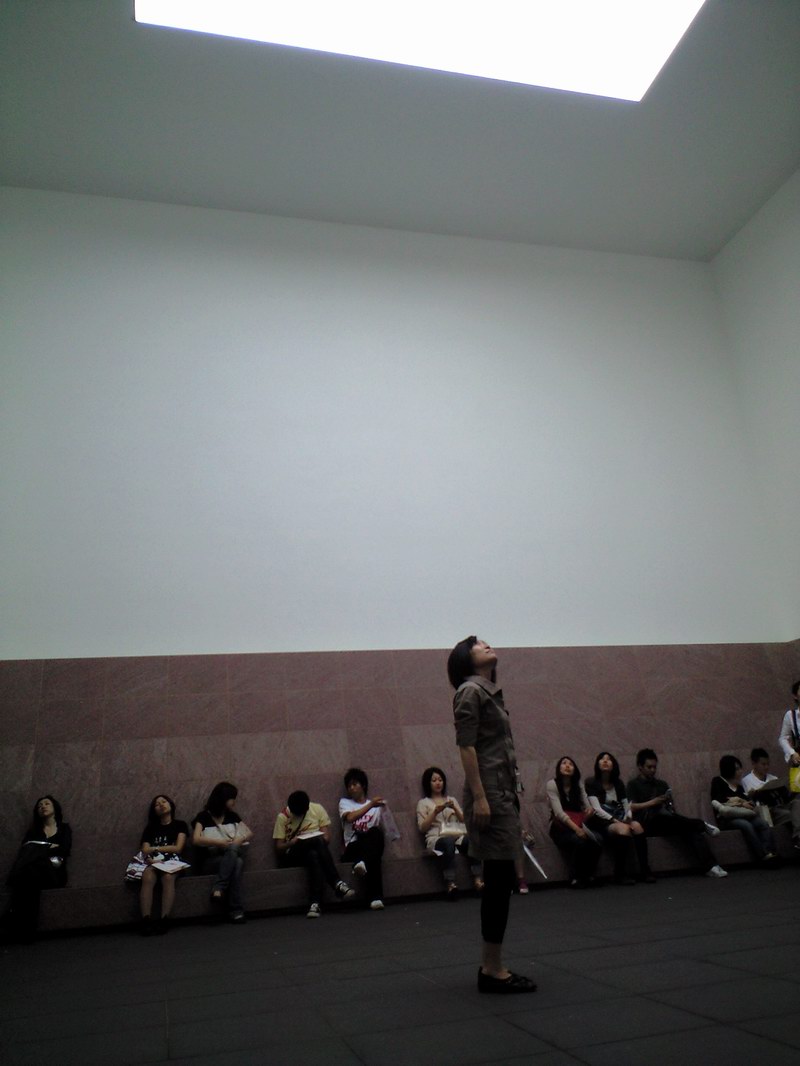 これは切り取られた空を作品として見ようという部屋(無料スペース)でぼけーっと上を見上げるオイラ(撮影:ゆかりん)。こうやって部屋に入ってきた人が真ん中で上を見上げるってのを繰り返している。きっと、周りに座る人も立って見上げてる人も、見上げた空も、全部作品の一部になる。