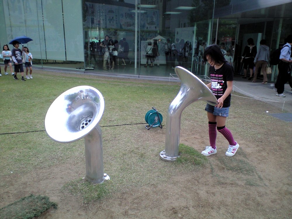 お庭にはこんなチューバのベルの様なモノが12個あって、これに向って喋るとお庭のどこかのベルから自分の声が聞こえるらしい。