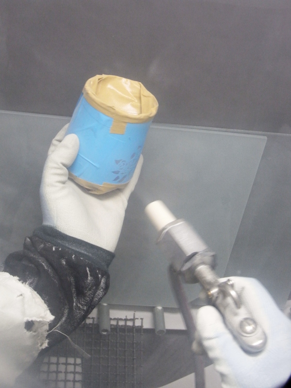 青いカッティングシートをカッターで切りぬいてサンドブラストをかけていきます。