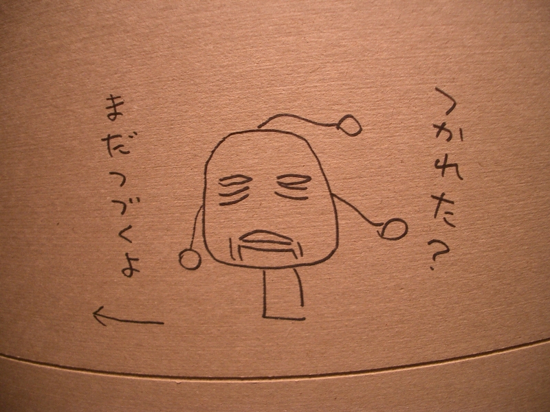 作者直筆の 落書き 注意書きやぼそっとコメントが強化ダンボールで作られた展示スペースの至る所に書かれています。