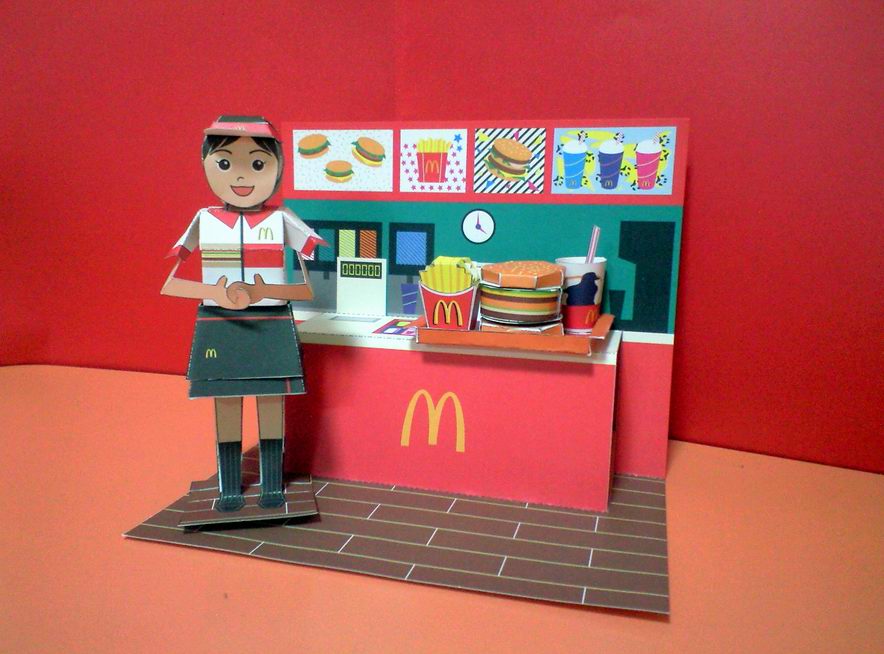 ポテトもハンバーガーもお姉さんの顔も体もスカートも全部立体なんですよ。