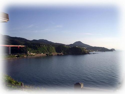 左の赤い橋が米山大橋。その右斜め下が崩れてしまった青海川駅です。
